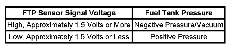The table illustrates the relationship between the FTP sensor signal voltage and the EVAP system pressure/vacuum.