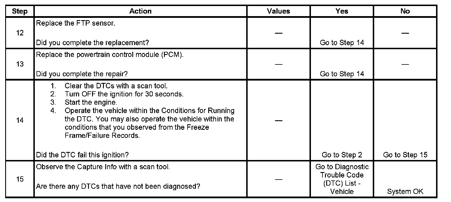 The fuel tank pressure (FTP) sensor measures the difference between the air pressure or vacuum in the evaporative emission (EVAP) system, and the outside air pressure. The control module supplies a 5-volt reference and a low reference circuit to the FTP sensor. The FTP sensor signal circuit voltage varies depending on EVAP system pressure or vacuum. If the FTP sensor signal voltage increases above a calibrated value, this DTC sets.