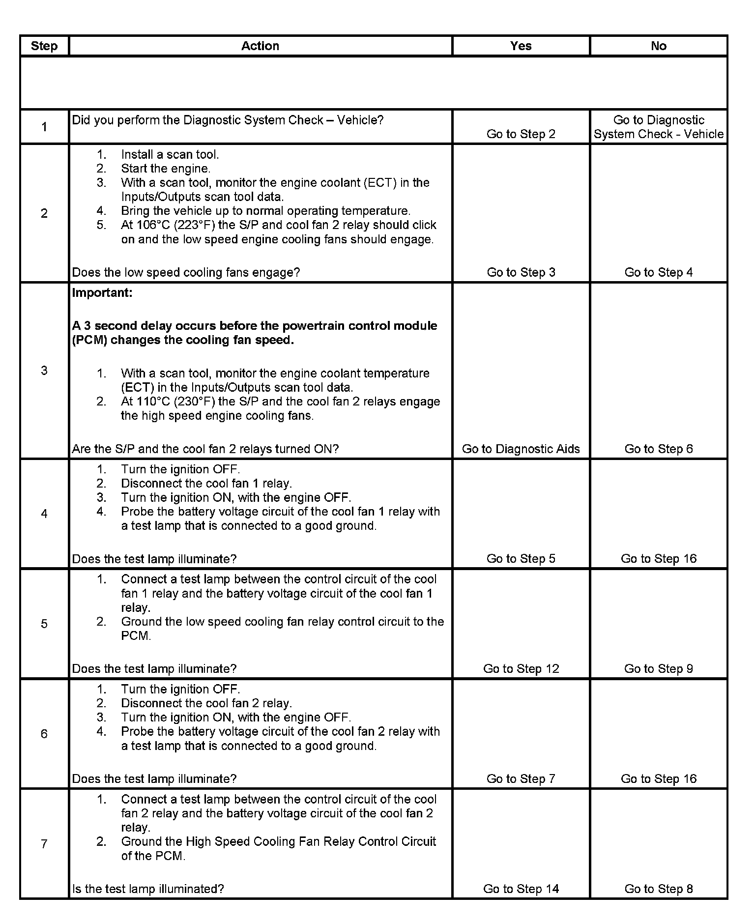 The numbers below refer to the step numbers on the diagnostic table.
