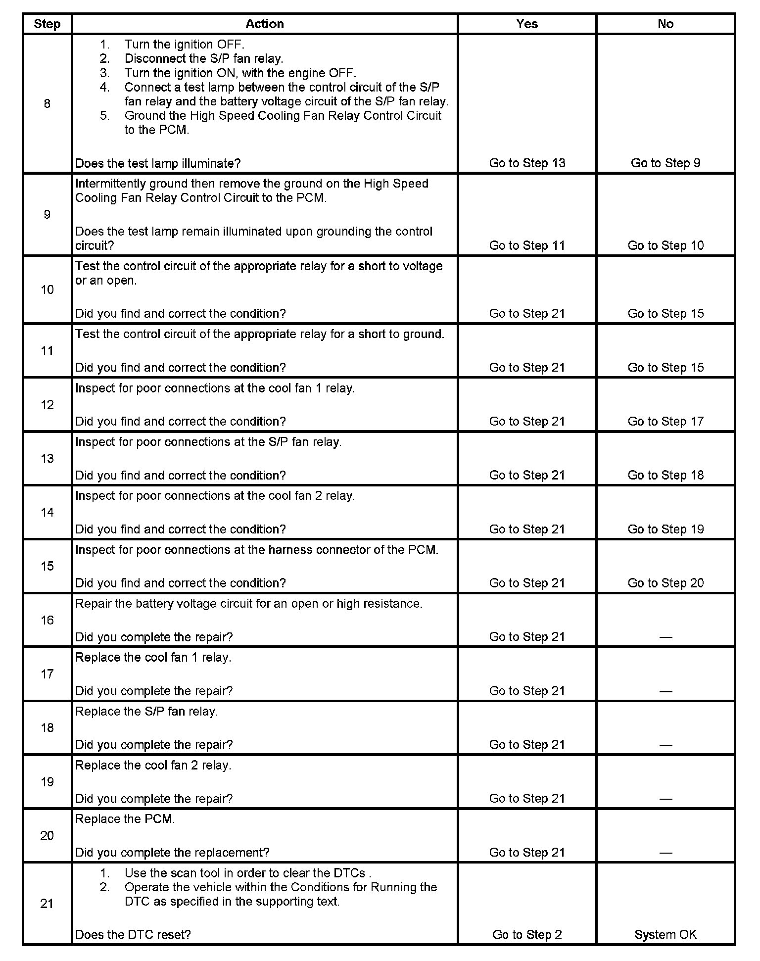 The powertrain control module (PCM) controls the low speed cooling fan operation by grounding the low speed fan relay control circuit with an internal solid state device called a driver. For high speed cooling fan operation, the PCM grounds the high speed and S/P relay control circuit at the same time the low speed control circuit is grounded. Battery positive voltage is supplied to the low speed, high speed and S/P fan relays. When the PCM is commanding a fan relay ON, the voltage of the control circuit should be low, near 0 volts. When the PCM is commanding a fan relay OFF, the voltage potential of the control circuit should be high, near battery voltage. If the fault detection circuit senses a voltage other than what is expected, the DTC will set.