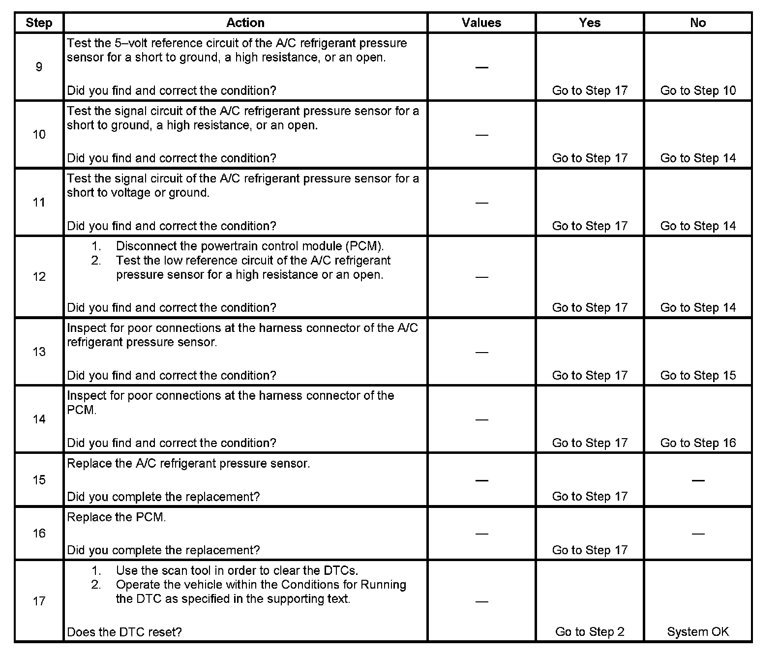 - The PCM detects that the A/C pressure is 9 psi (0.2 volts) or less.