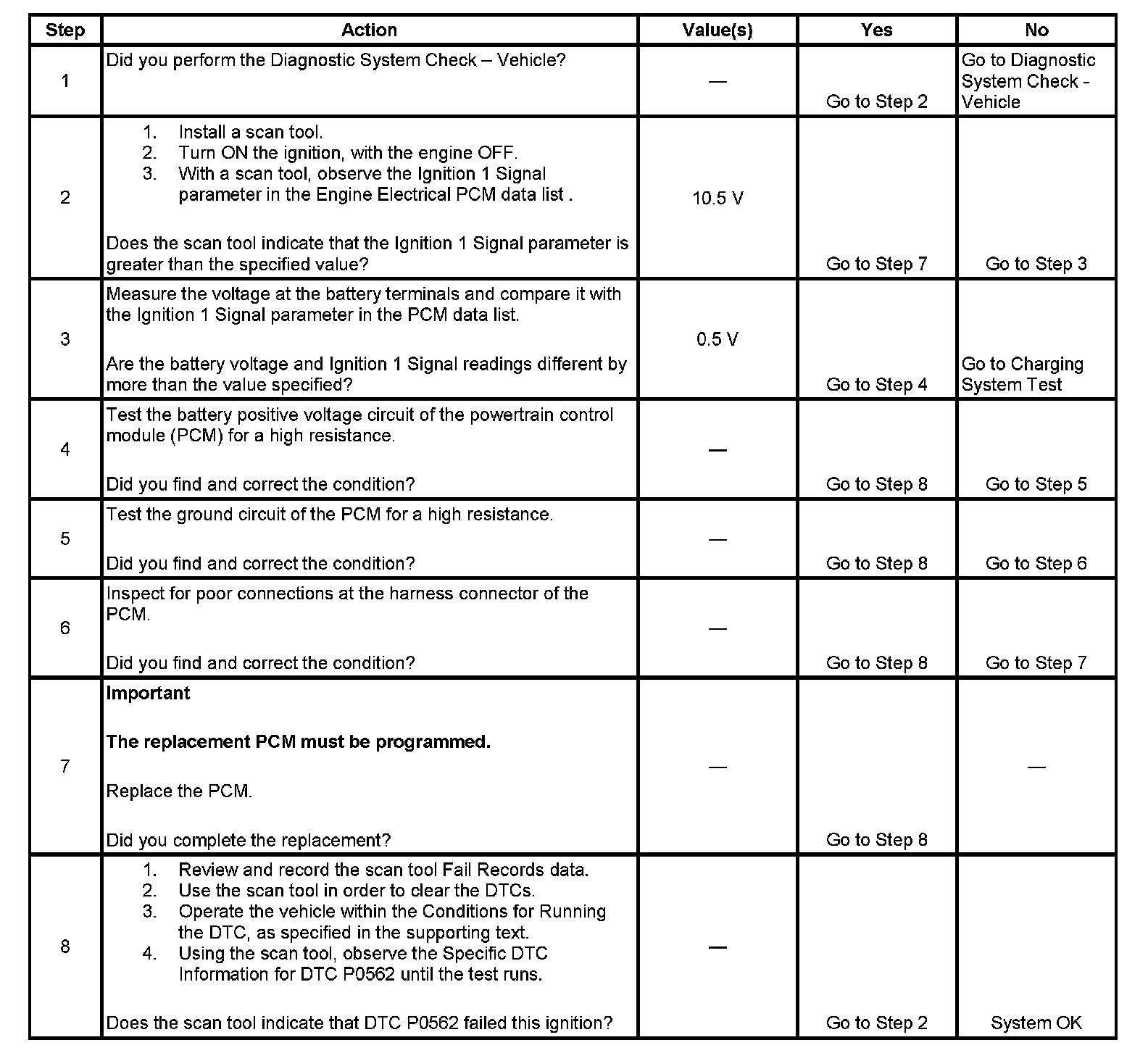 The powertrain control module (PCM) monitors the system voltage to ensure that the voltage stays within the proper range. Damage to components, and incorrect input can occur when the voltage is out of range. The PCM monitors the system voltage over an extended length of time. If the PCM detects an excessively low system voltage, DTC P0562 will set.