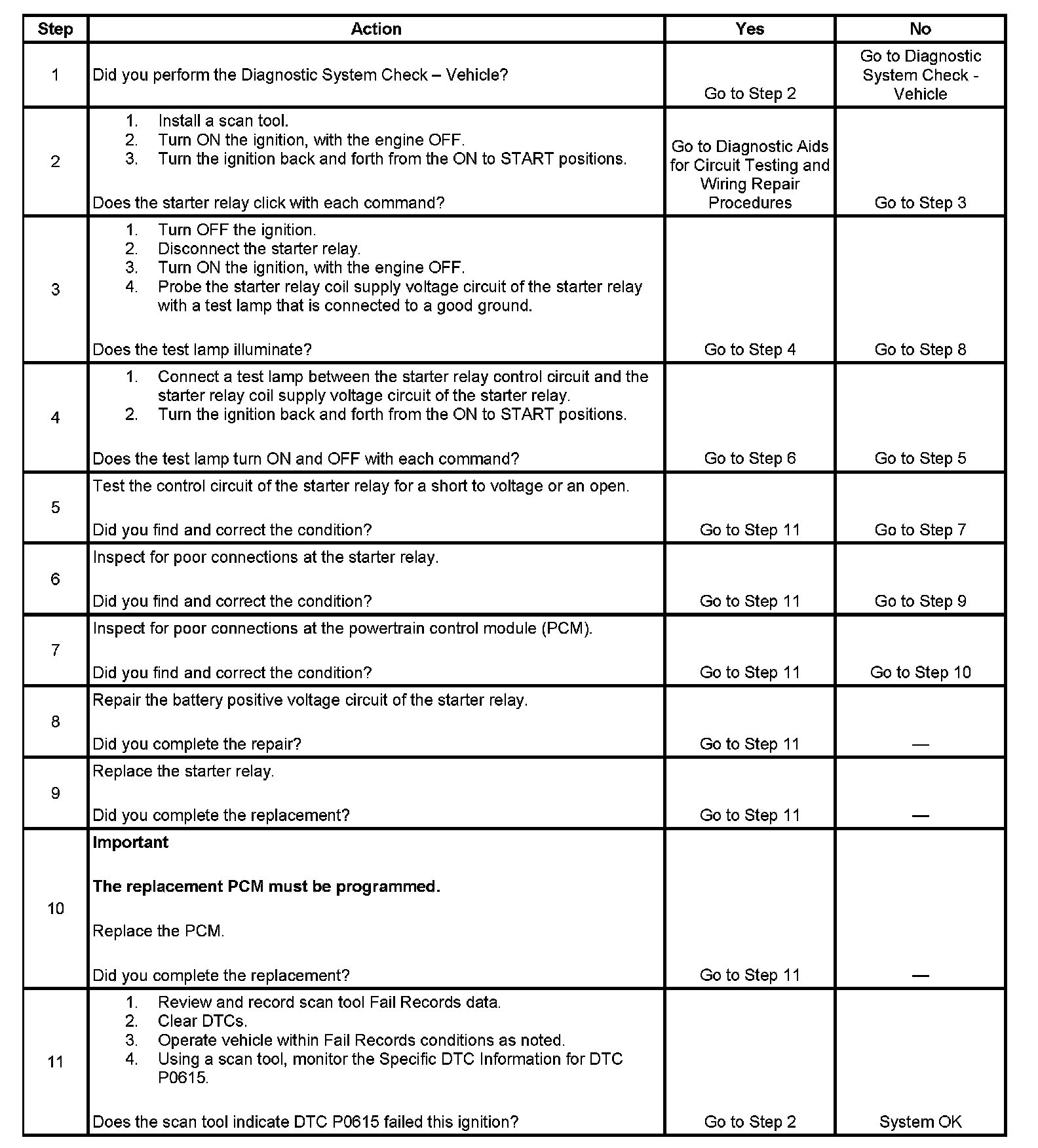 The powertrain control module (PCM) supplies a ground path for the starter relay when start enable has been requested. The PCM monitors this circuit for conditions that are incorrect for the commanded state. If the PCM detects an improper circuit condition, starter relay DTC P0615 will set.