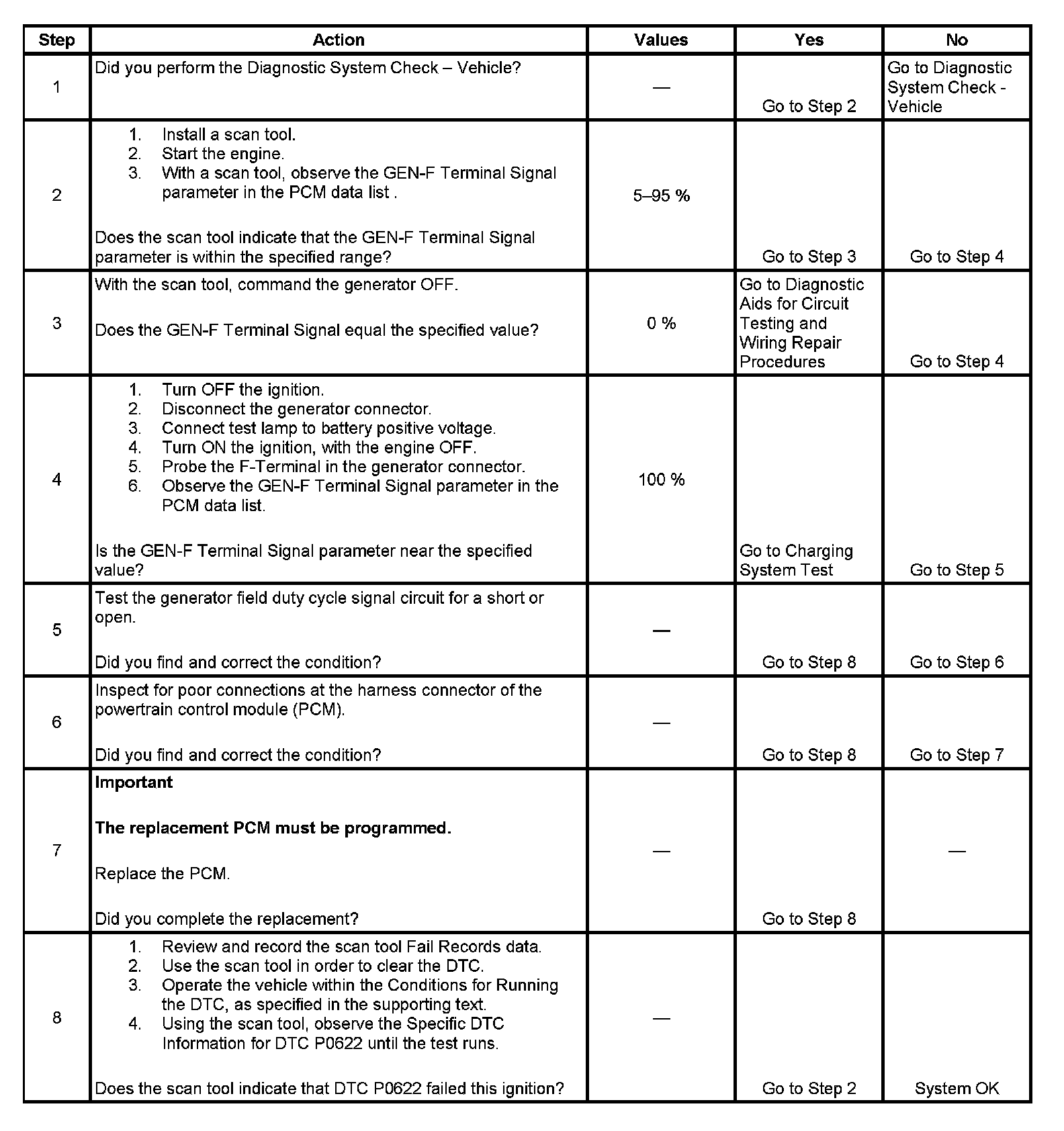 The PCM monitors the state of the generator field duty cycle signal circuit. When the key is in the RUN position and the engine is OFF, the PCM should detect a duty cycle near 0 percent. However, when the engine is running, the duty cycle should be between 5 percent and 100 percent. The PCM monitors the PWM signal using a key ON test and a RUN test. During the tests, if the PCM detects an out of range PWM signal, DTC P0622 will set. When the DTC sets, the PCM will send a serial data message to the instrument panel cluster (IPC) to illuminate the charge indicator.