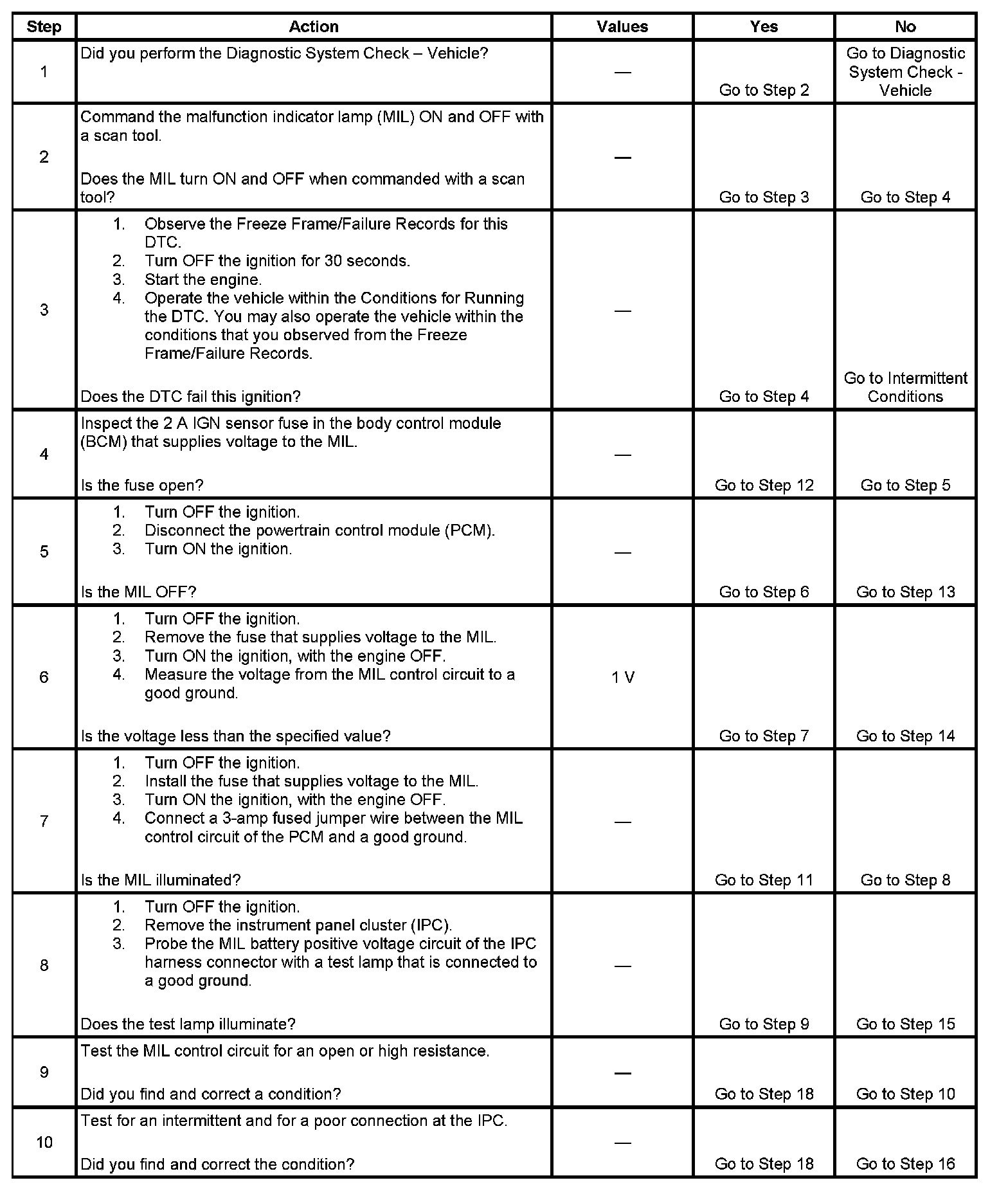 The malfunction indicator lamp (MIL) is located on the instrument panel cluster (IPC). The MIL informs the driver that an emission system fault has occurred and that the engine control system requires service. The control module monitors the MIL control circuit for conditions that are incorrect for the commanded state of the MIL. For example, a failure condition exists if the control module detects low voltage when the MIL is commanded OFF, or high voltage when the MIL is commanded ON. If the control module detects an improper voltage on the MIL control circuit, DTC P0650 will set.
