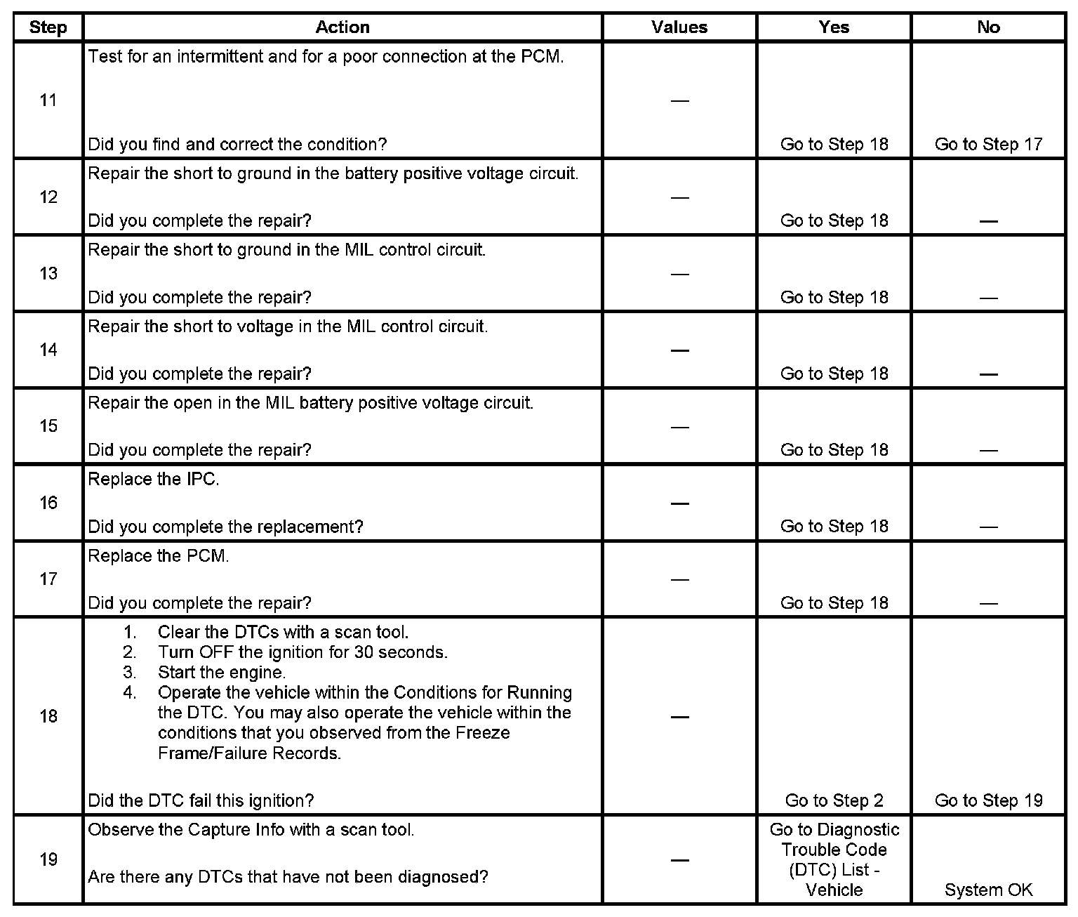 5. This step tests for a short to ground in the MIL control circuit. With the powertrain control module (PCM) disconnected and the ignition ON, the MIL should be OFF.