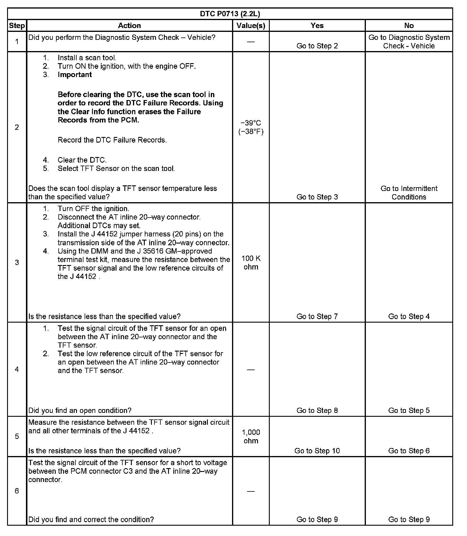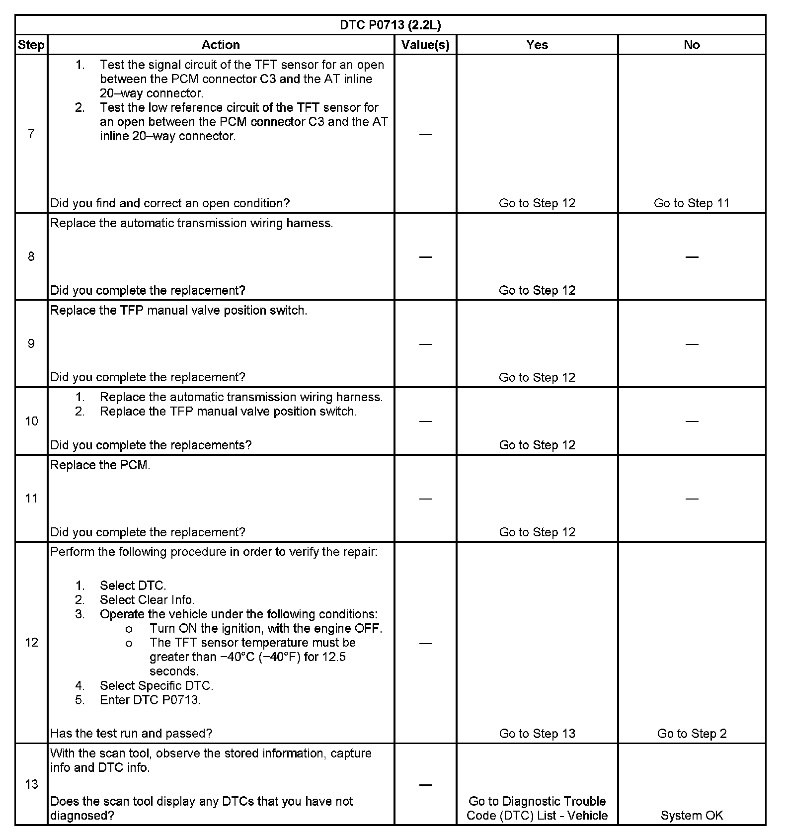 When the PCM detects a continuous open or short to voltage in the TFT circuit or the TFT sensor, then DTC P0713 sets. DTC P0713 is a type C DTC.