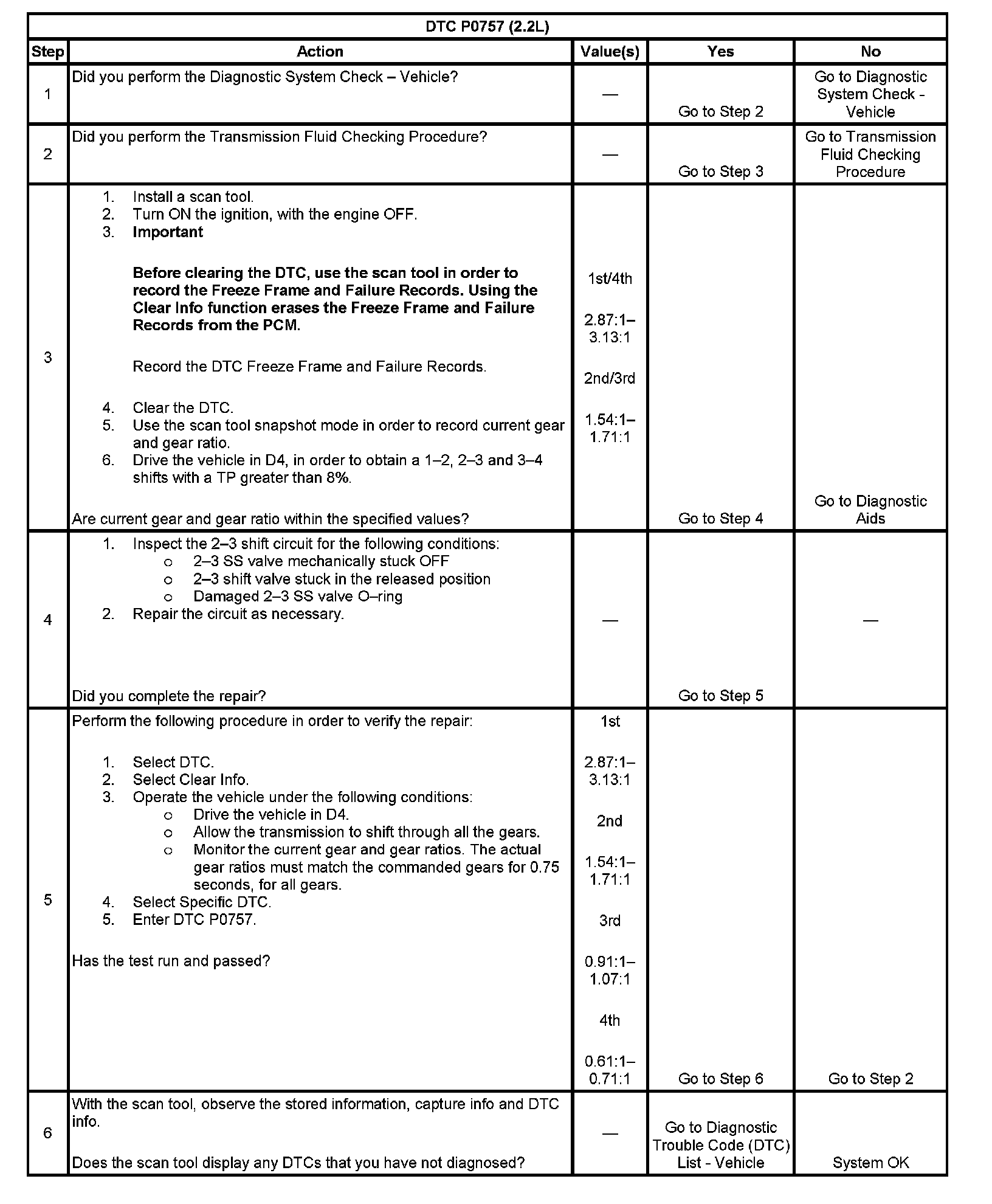 When the PCM detects a 1-2-2-1 shift pattern, then DTC P0757 sets. DTC P0757 is a type A DTC.