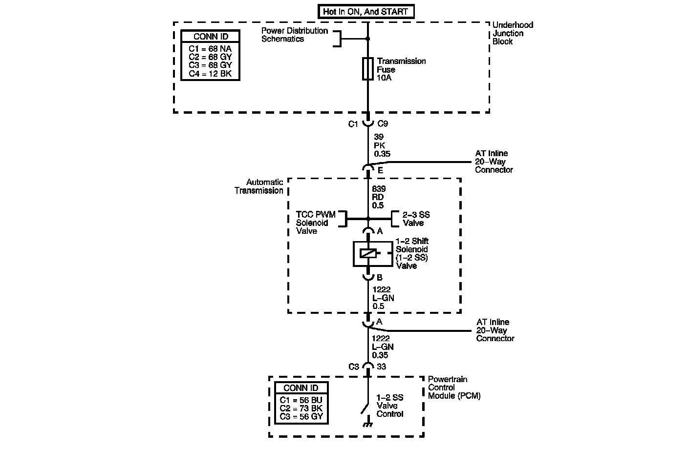 The 1-2 shift solenoid (SS) valve controls transmission fluid pressure acting on the 1-2 and 3-4 shift valves to position the valves for the appropriate gear. The 1-2 SS valve is a normally open exhaust valve located on the lower control valve body. Ignition voltage is supplied to the solenoid. The powertrain control module (PCM) commands the solenoid ON or OFF by providing a ground path. When the 1-2 SS valve is commanded ON, the PCM senses low voltage. When the 1-2 SS valve is commanded OFF, the PCM senses high voltage.