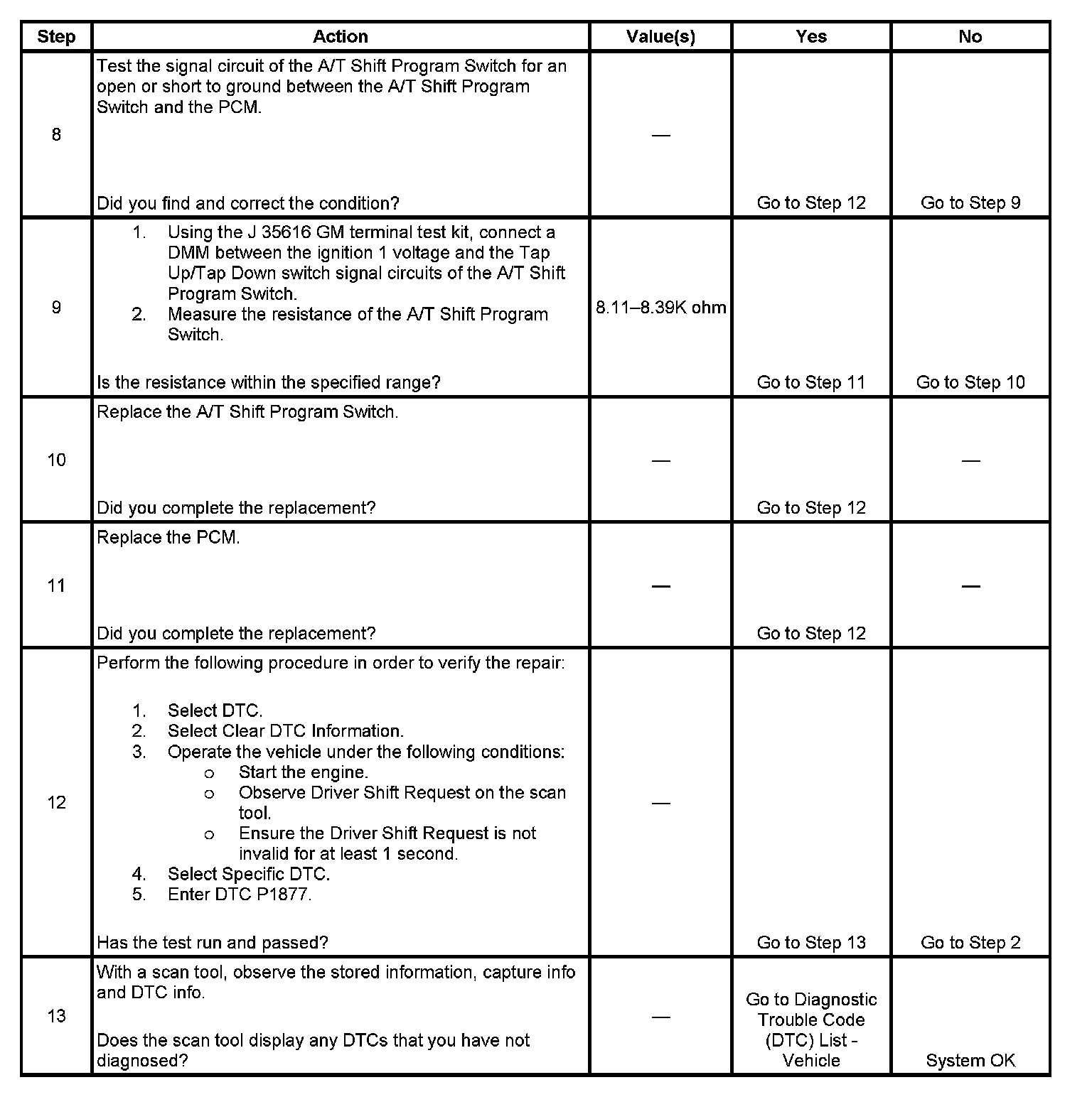 If the powertrain control module (PCM) detects TAP enable switch Inactive and the TR switch indicates D3, DTC P1877 sets. DTC P1877 is a type C DTC.