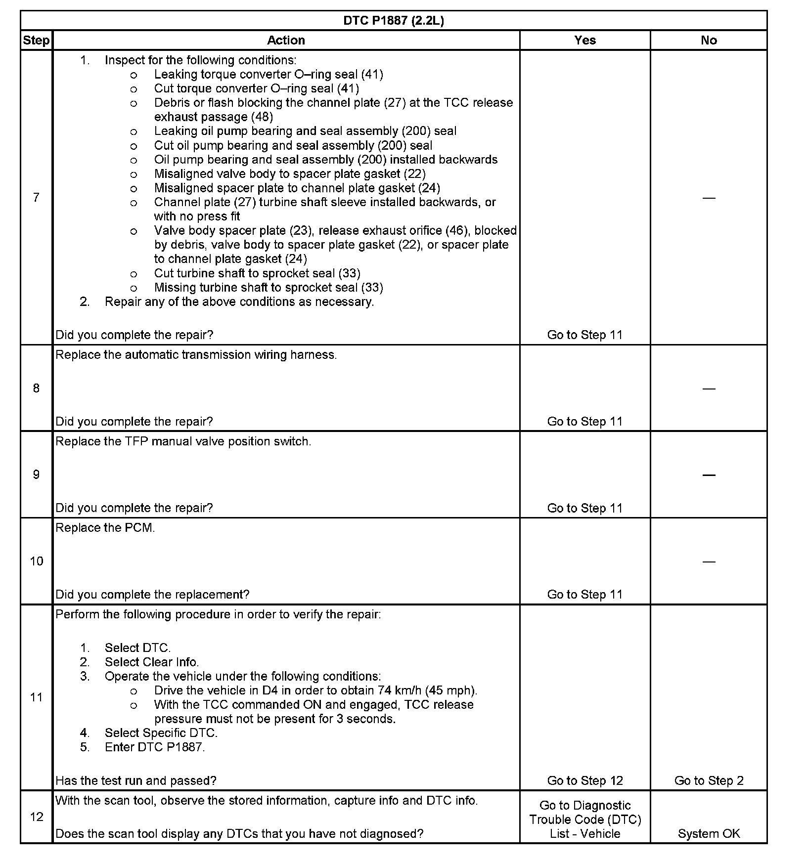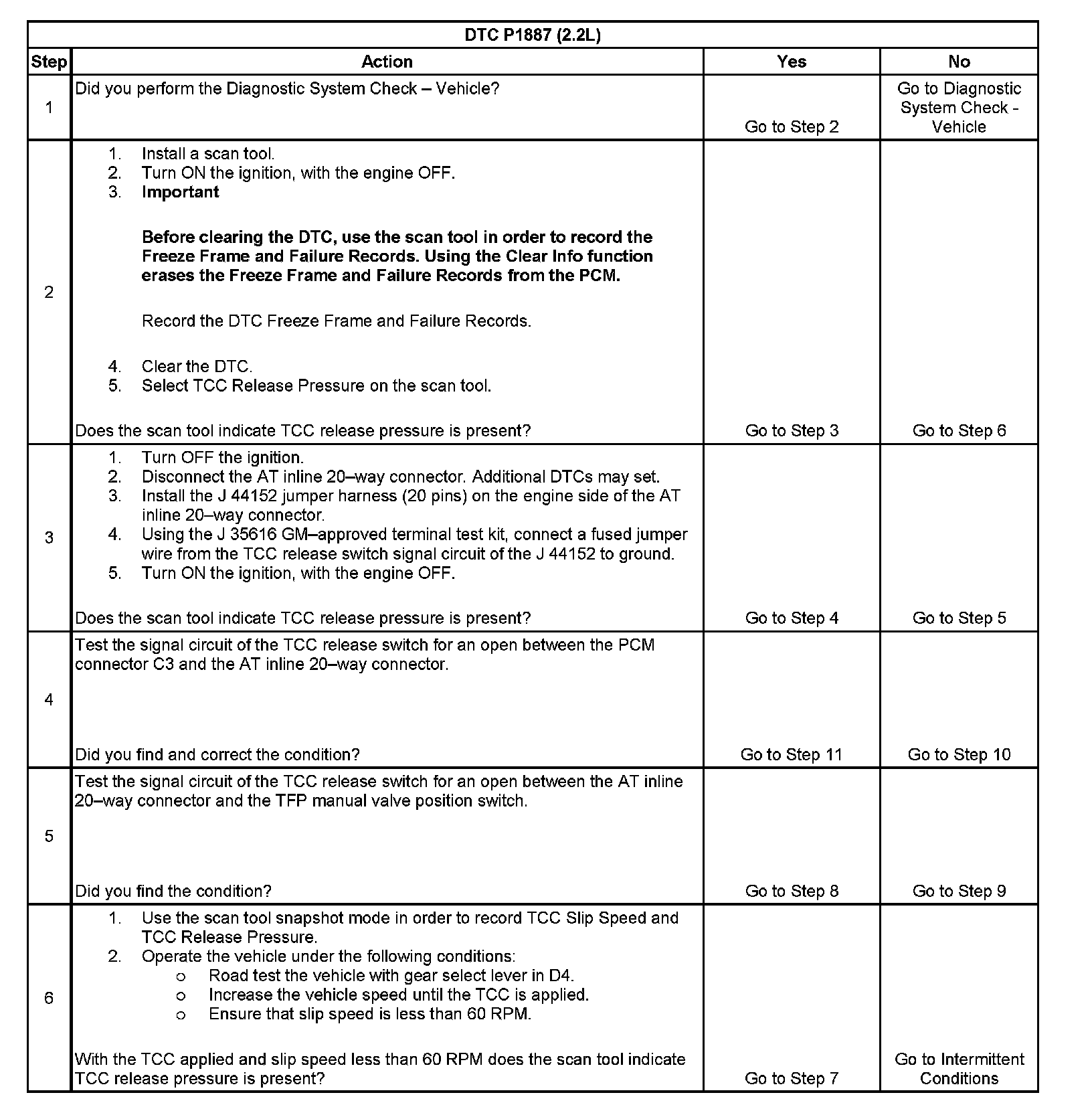 When the PCM determines that the TCC release switch is open, indicating that the TCC is not applied, and the TCC slip speed indicates that the TCC is applied, then DTC P1887 sets. DTC P1887 is a type B DTC.