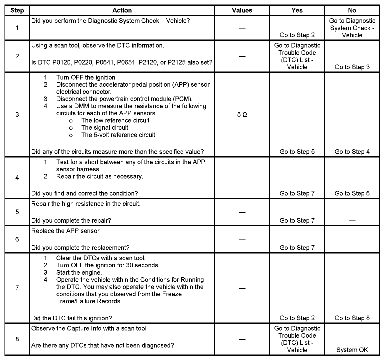 2. Any circuit faults on either APP sensor 1 or 2 will set one of the DTCs listed. Refer to the appropriate table for diagnosis.