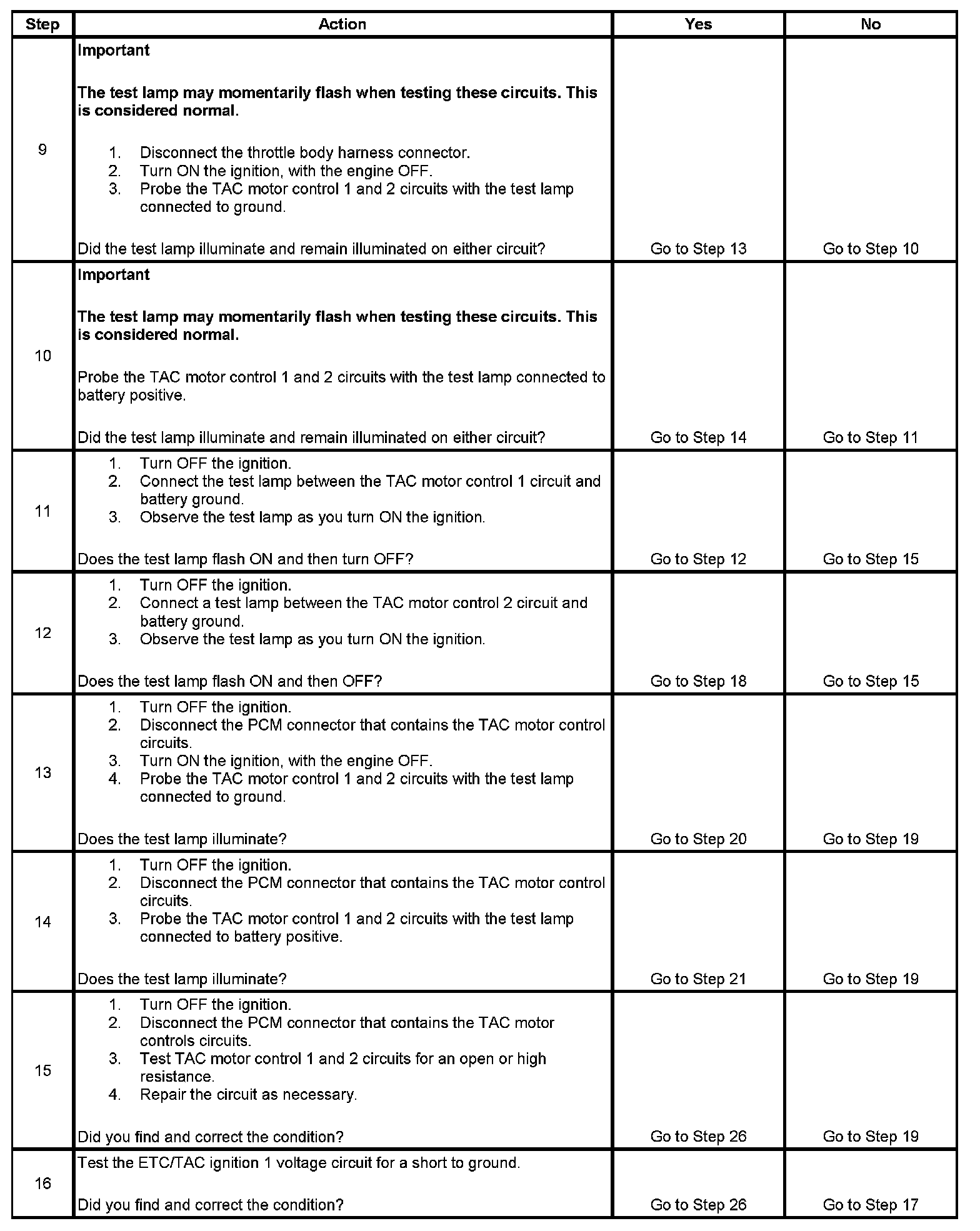 11. When the ignition is turned ON, the PCM operates the throttle control motor to verify the integrity of the system prior to start-up. This can be seen by the momentary flash of the test lamp as the ignition is turned ON.