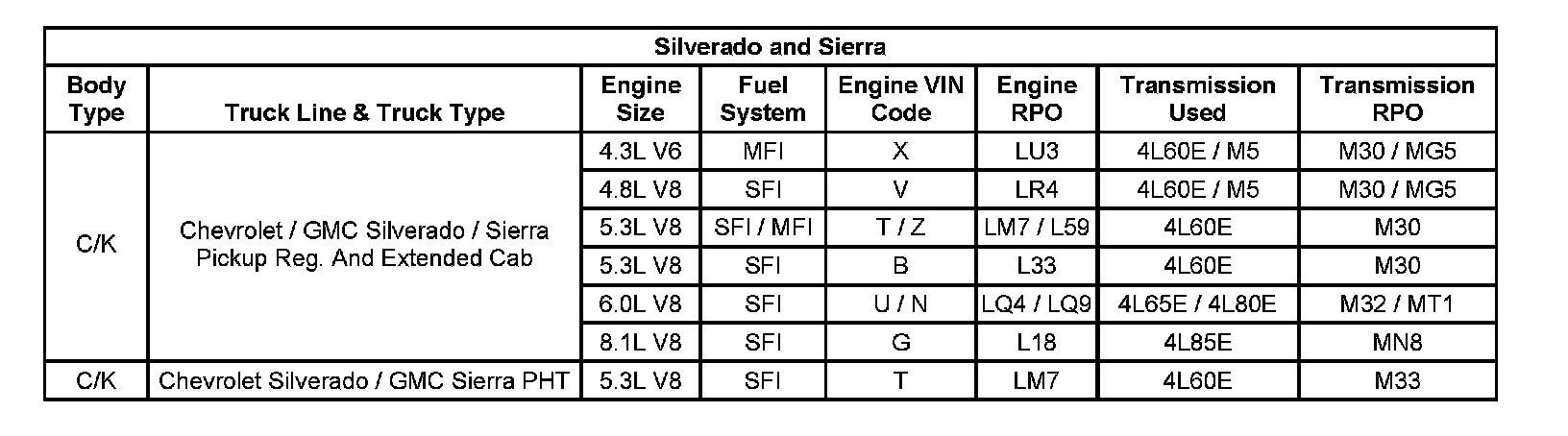 Engine and Transmission Usage (Silverado and Sierra Applications)