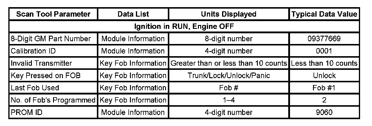 The Keyless Entry Scan Tool Data List contains all of the keyless entry related parameters that are available on the scan tool. The parameters in the list are arranged in alphabetical order. The column, Data List, indicates the location of the parameter within the scan tool menu selections. Use the Keyless Entry Scan Tool Data List as directed by a diagnostic table or in order to supplement the diagnostic procedures. Begin all of the diagnostic procedures with the Diagnostic System Check - Vehicle in Vehicle DTC Information.