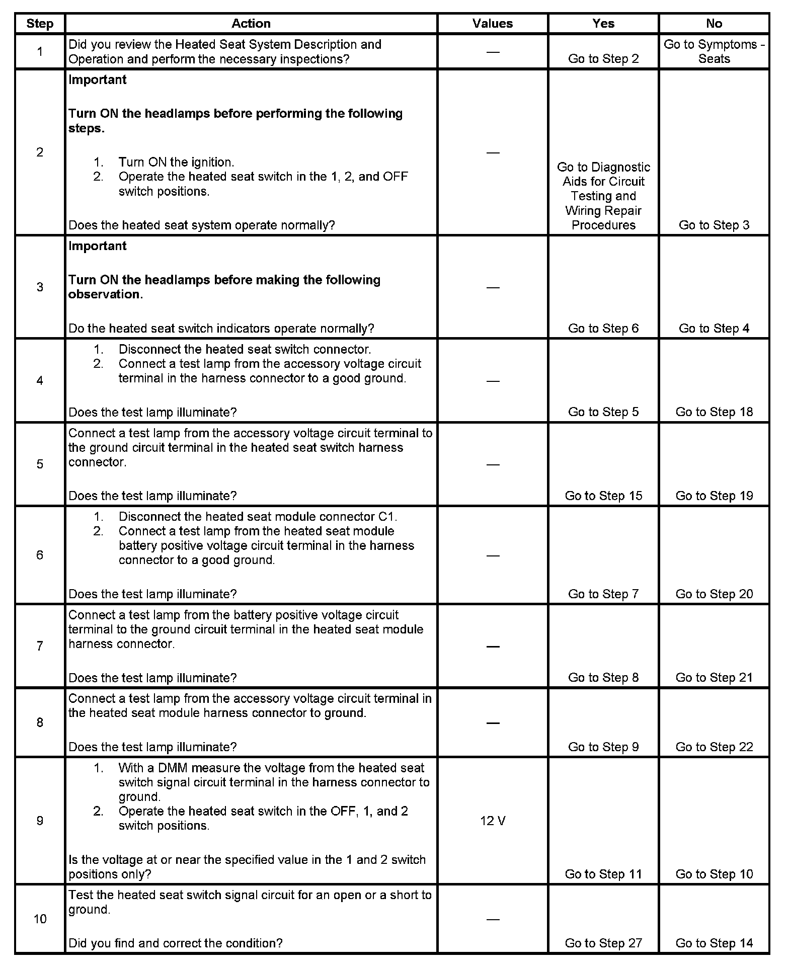 2. This step helps to pinpoint the specific nature of the failure. Turning the headlamps ON prior to verifying the presence of a symptom will help to determine if the failure may be caused by an open switch ground circuit.