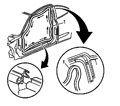 1. Apply weatherstrip adhesive GM P/N 12345096 (Canadian P/N 993365), or equivalent, to the front door opening weatherstrip (1).