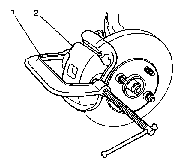 7. Install a large C-clamp (1) over the body of the brake caliper (2) with the C-clamp ends against the rear of the caliper body and against the outer brake pad.