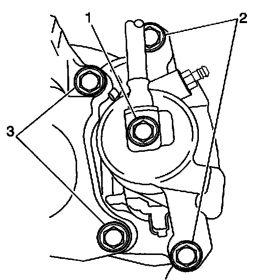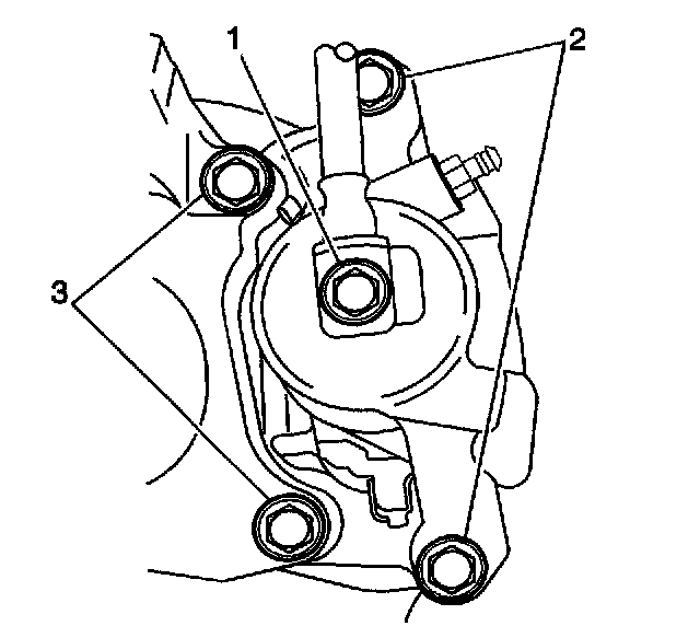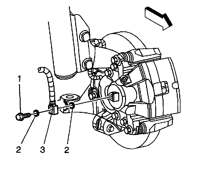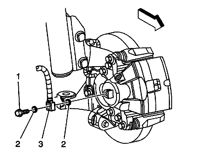 4. Install NEW copper brake hose gaskets (2) to the brake hose-to-caliper bolt (1) and to the brake hose (3).