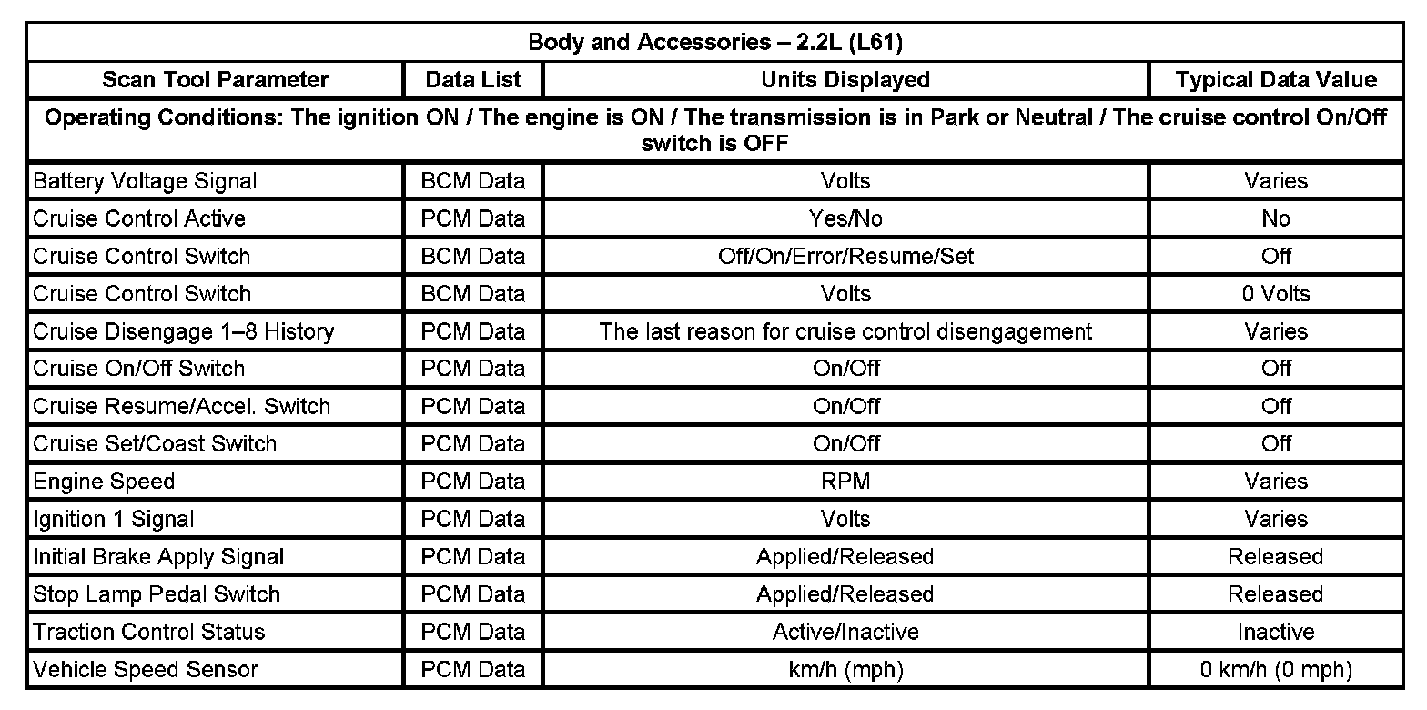 The scan tool data lists contain all of the cruise control related parameters that are available on the scan tool. The parameters in the list are arranged in alphabetical order. The data list column indicates the location of the parameter within the scan tool menu selections.