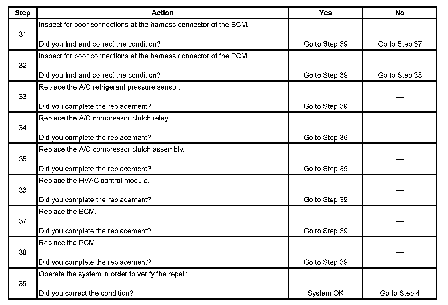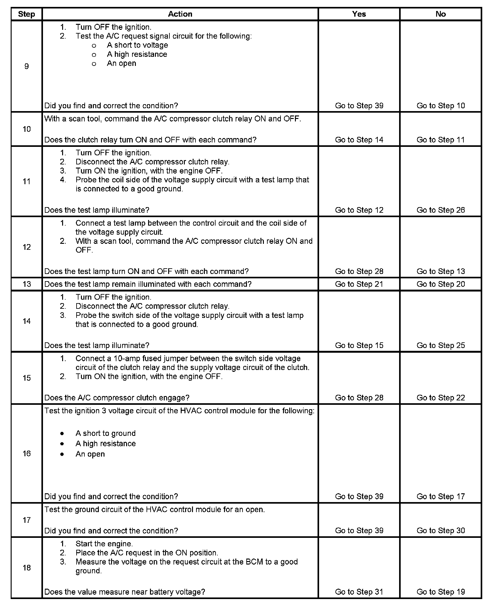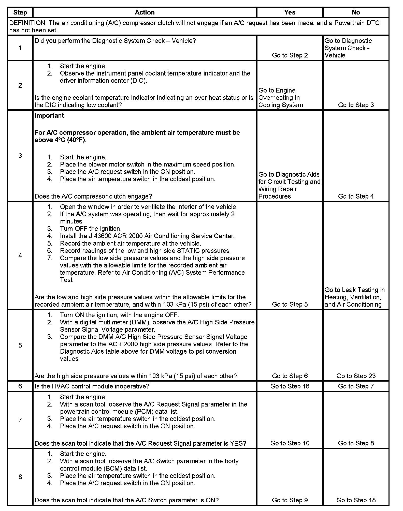 The numbers below refer to the step numbers on the diagnostic table.