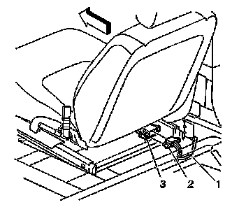 6. Remove the connector position assurance (CPA) (1) from the RF/passenger side impact module yellow connector (3) which is located under the passenger seat.