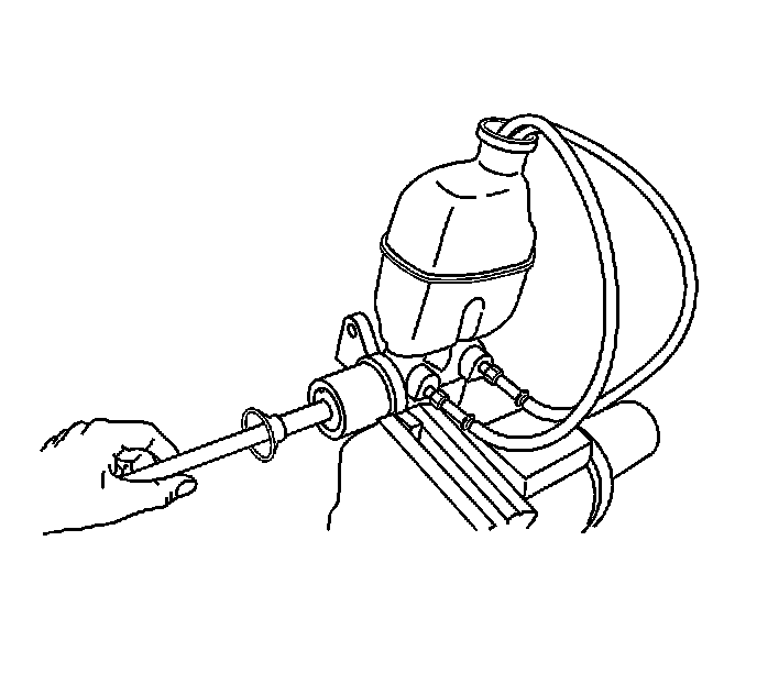 7. Using a smooth, round-ended tool, depress and release the primary piston as far as it will travel, a depth of about 25 mm (1 inch), several times. Observe the flow of fluid coming from the ports.As air is bled from the primary and secondary pistons, the effort required to depress the primary piston will increase and the amount of travel will decrease.
