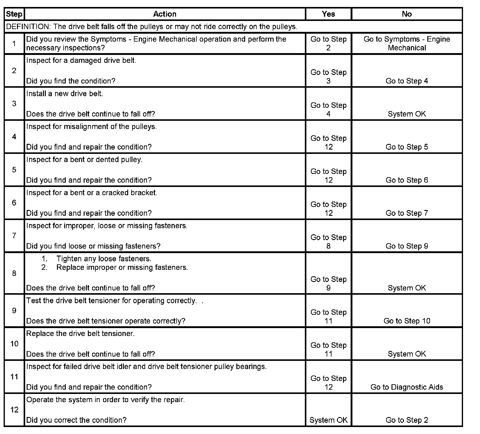An extra load that is quickly applied on released by an accessory drive component may cause the drive belt to fall off the pulleys. Verify the accessory drive components operate properly.