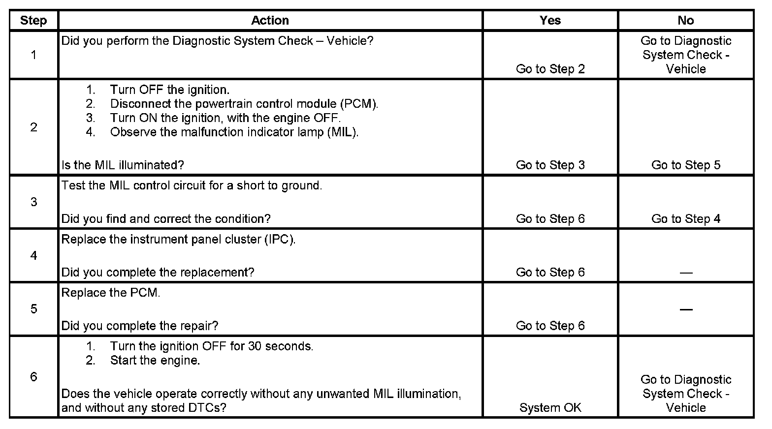 2. This step determines if the condition is with the MIL control circuit or the PCM.