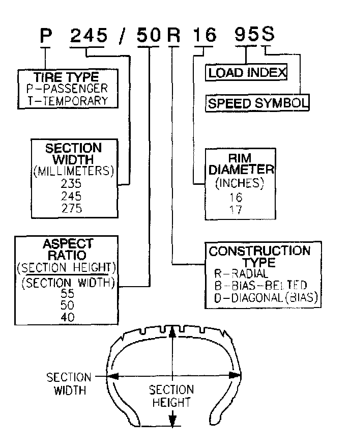 Most P-metric tire sizes do not have exact corresponding alphanumeric tire sizes. Replacement tires should be of the same tire performance criteria TPC specification number including the same size, the same load range, and the same construction as those originally installed on the vehicle. Consult a tire dealer if you must replace the P-metric tire with other sizes. Tire companies can best recommend the closest match of alphanumeric to P-metric sizes within their own tire lines. The above illustration may not correspond with your vehicle, but is meant as an example.