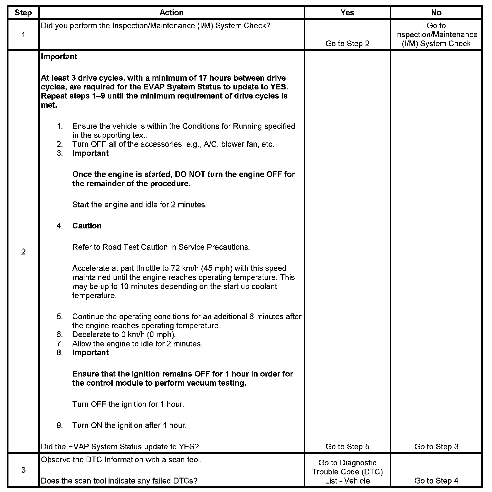 The purpose of this procedure is to satisfy the enable criteria necessary to execute inspection/maintenance (I/M) readiness diagnostics for the evaporative emission (EVAP) system. The procedure may be used to set the EVAP I/M System Status display on the scan tool to YES. The EVAP I/M System Status display indicates whether or not the control module has completed the readiness diagnostics. The readiness diagnostics complete when all DTCs comprising the diagnostics run and pass, or any DTC comprising the diagnostics illuminates the malfunction indicator lamp (MIL). If the diagnostics pass during one drive cycle, seventeen hours must elapse, regardless of whether the vehicle is driven or not. Then, the diagnostics will run again during the next drive cycle in which the conditions for running are met. Once the diagnostics have passed during the third drive cycle, the EVAP I/M System Status display will be updated to YES. A failed or aborted diagnostic will require the vehicle to cool down in order to meet the enable criteria for another drive cycle. Therefore, performing a visual inspection prior to running the EVAP test may prevent having to repeat the drive cycle.