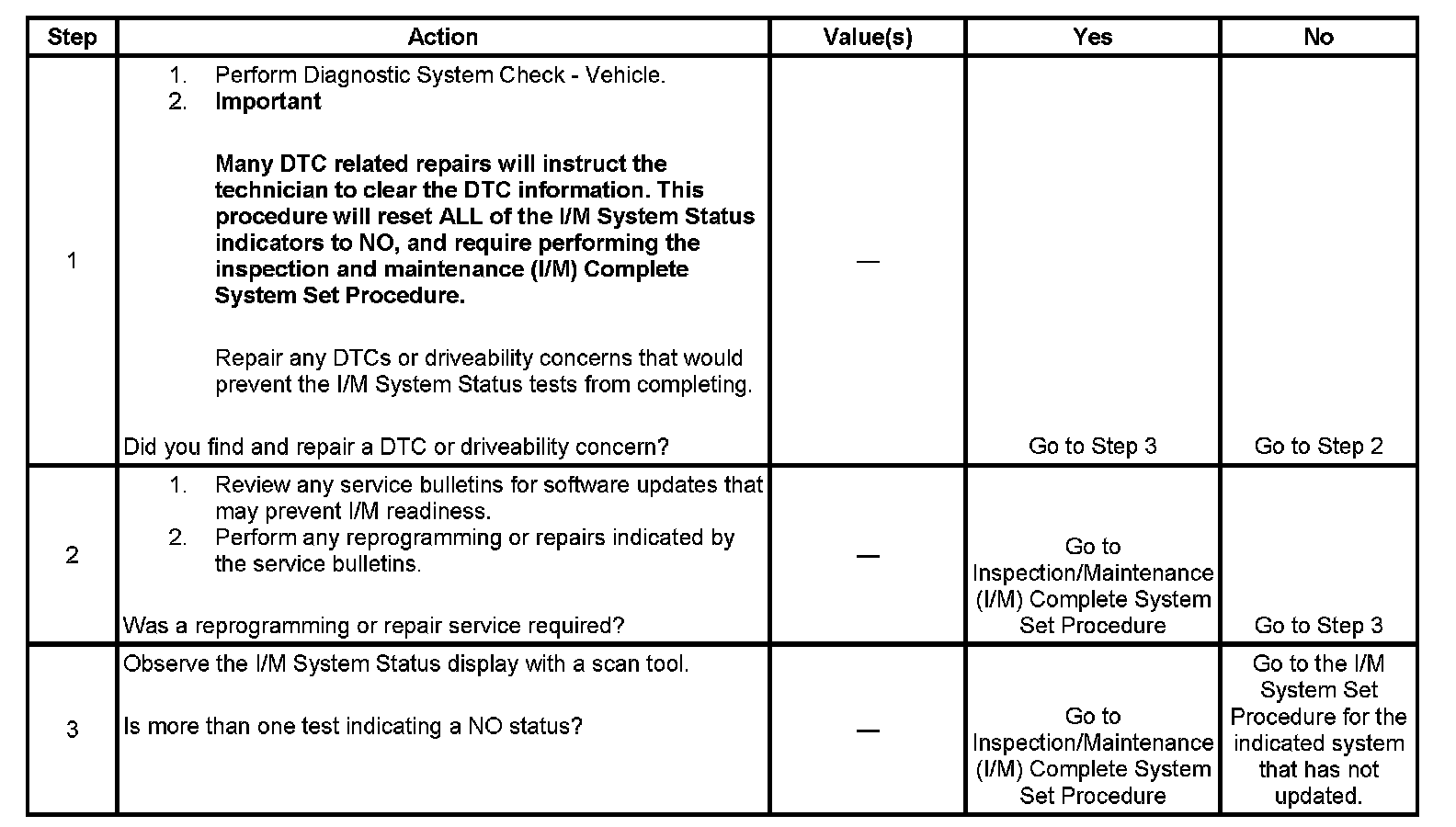 For the specific DTCs required for each system, refer to Inspection/Maintenance (I/M) System DTC Table. Systems such as fuel delivery, misfire, and comprehensive components may not be listed in a system status list. These tests run continuously and do not require an I/M System Status indicator. Inspection/Maitenance (I/M) System (DTC) Table