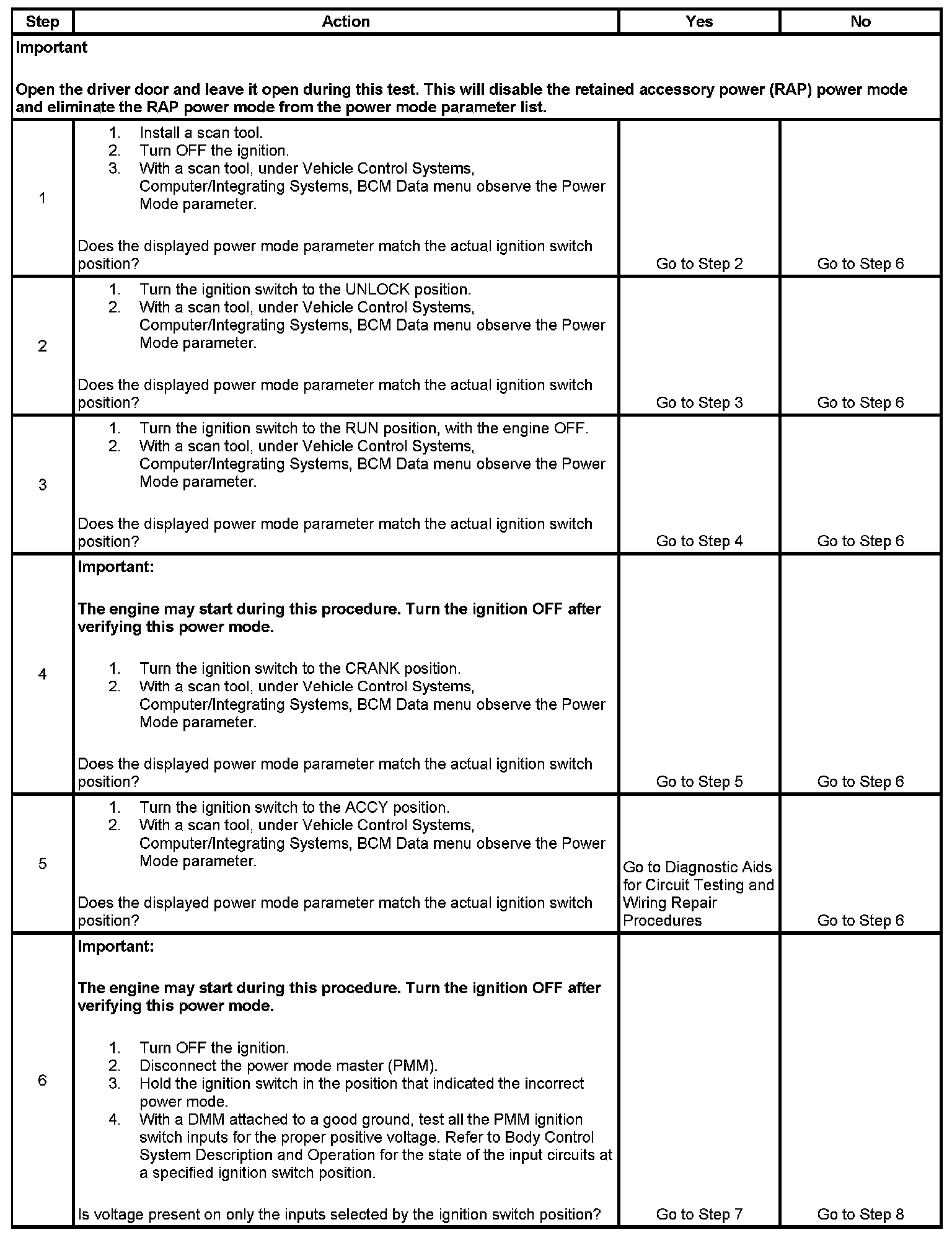 Normal vehicle serial data communications and the control modules operations will not begin until the system power mode has been identified. Discrete wires from the ignition switch contacts are monitored by a module which acts as the power mode master (PMM) in order to determine the correct power mode. The module which is the PMM communicates the system power mode to all modules on the serial data lines. Refer to Body Control System Description and Operation to identify which module is the PMM and the applicable power mode look up table.
