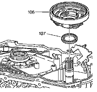 2. Remove the input carrier to forward clutch hub thrust bearing (107). The input carrier to forward clutch hub thrust bearing may have remained with the input carrier.