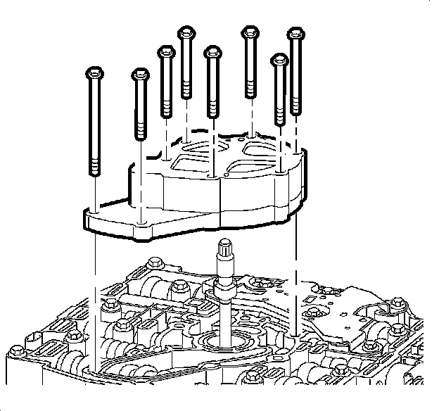 Install the oil pump assembly onto the oil pump shaft and the control valve body. Hand start and install the oil pump assembly bolts.