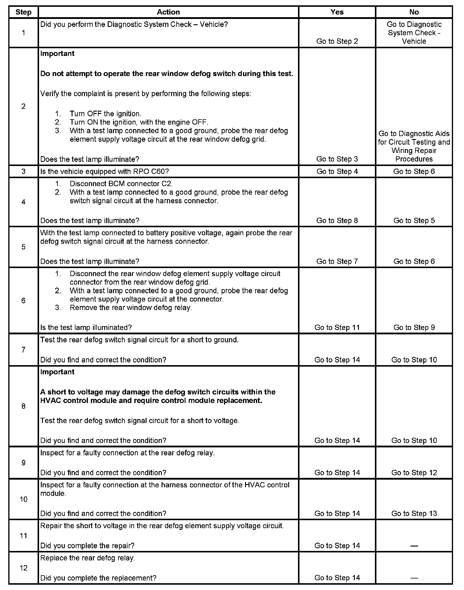 8. This step will determine if the rear defog switch signal circuit is shorted to voltage. This condition may damage the rear window defog switch circuits internal to the HVAC control module, requiring control module replacement.