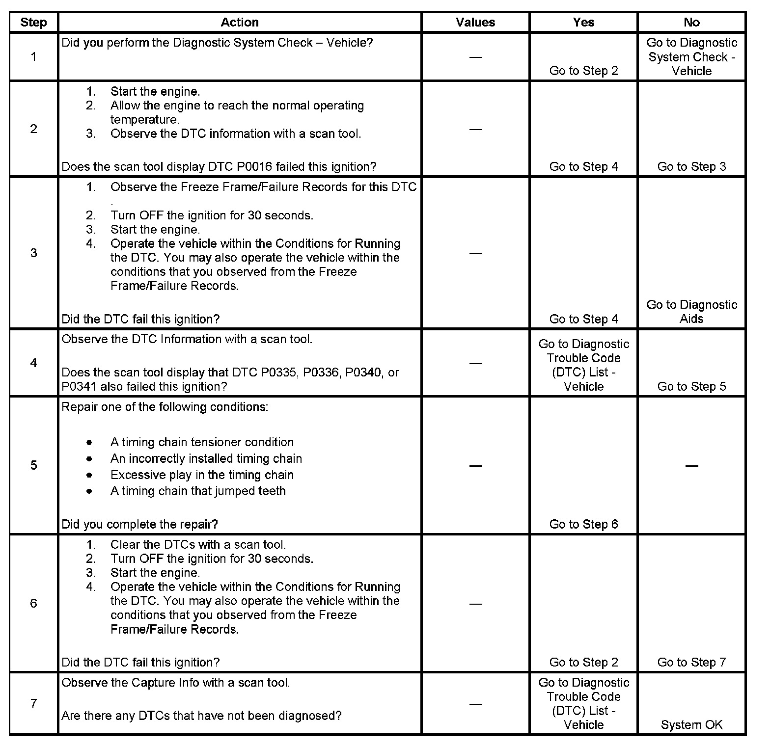5. This step inspects for any recent engine mechanical repairs. An incorrectly installed camshaft, crankshaft, or timing chain can cause this DTC to set.