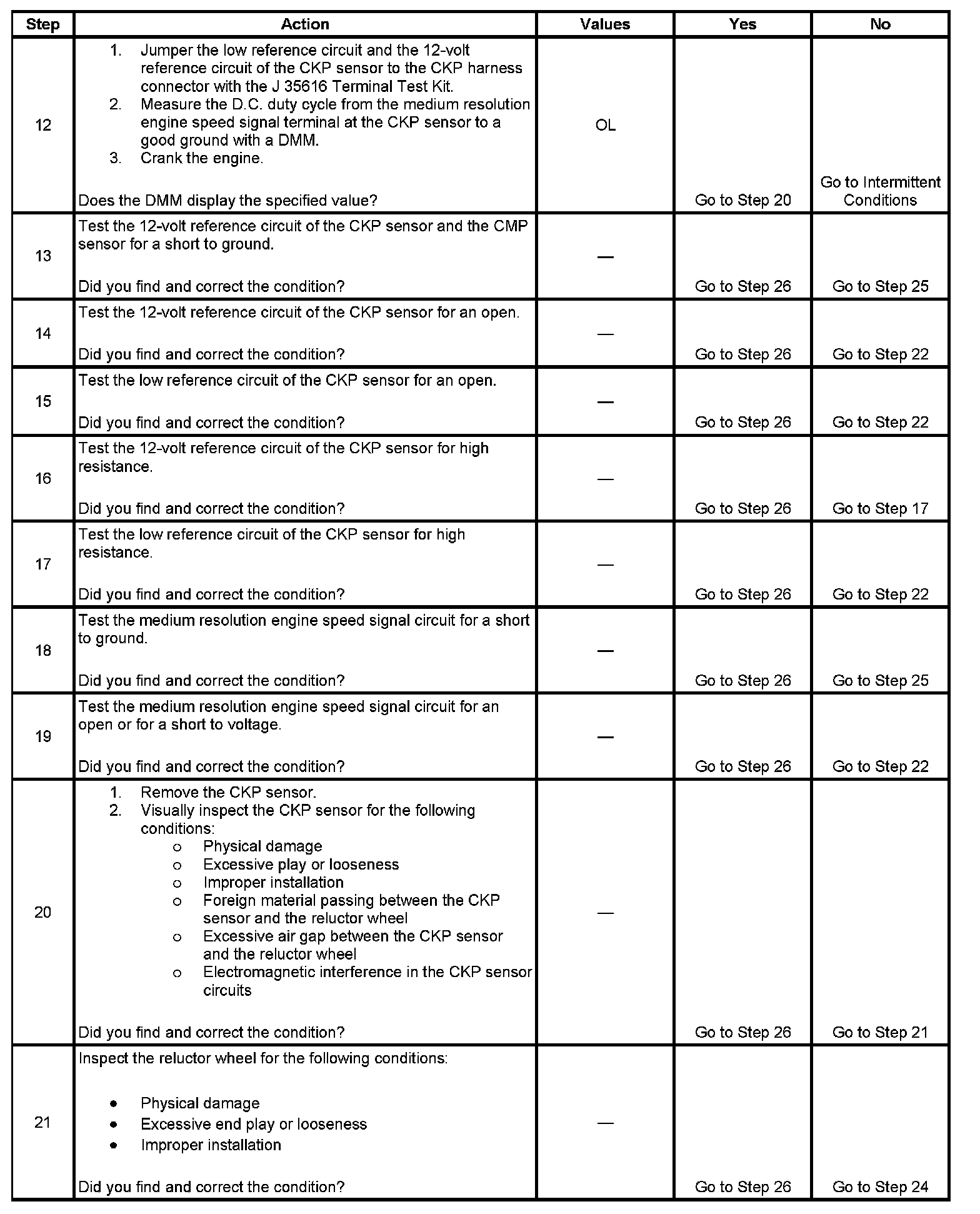 The crankshaft position (CKP) sensor is a 24X sensor. It provides 24 digital ON/OFF signals to the powertrain control module (PCM) per revolution of the crankshaft. This information is used by the PCM for ignition timing, fuel injector timing, misfire diagnostics, and tachometer display. The PCM supplies 12 volts to the sensor on the 12-volt reference circuit, and provides a ground on the low reference circuit. The CKP sensor provides signals to the PCM on the medium resolution engine speed signal circuit. The PCM monitors the CKP sensor for errors. If the PCM does not receive a signal from the CKP sensor, DTC P0335 sets.