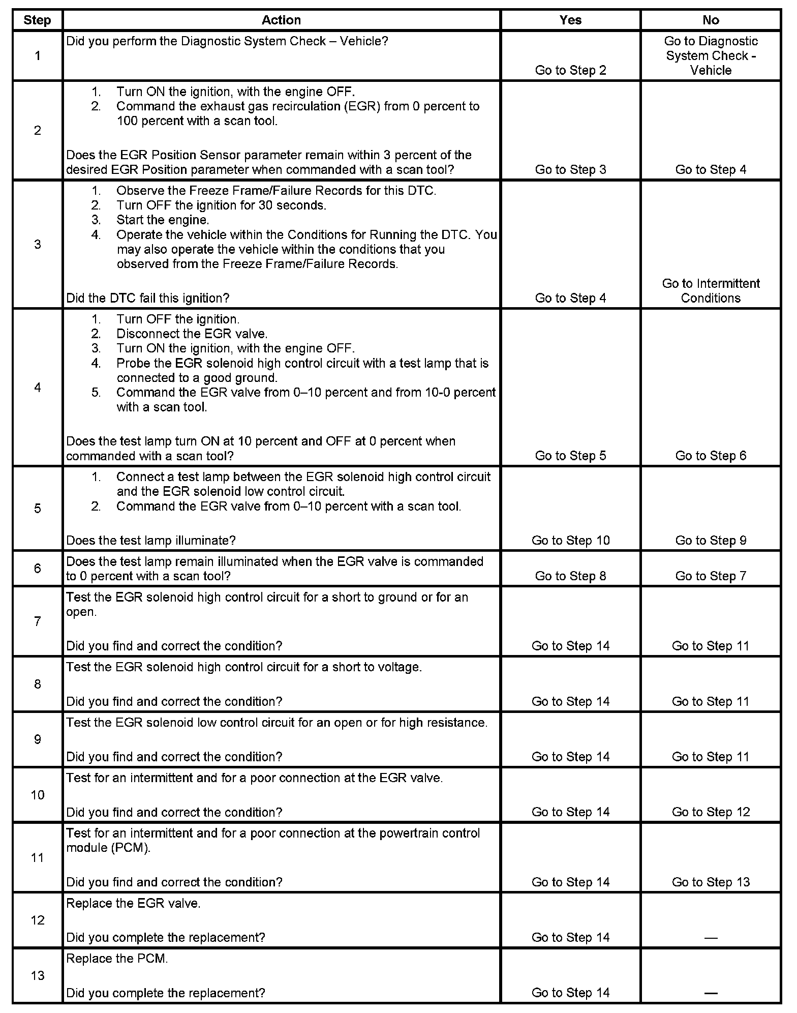 The powertrain control module (PCM) controls the exhaust gas recirculation (EGR) valve with a solid state device called a driver. The driver supplies the EGR solenoid with 12 volts that is pulse width modulated (PWM) through the EGR solenoid high control circuit. A ground path is provided by the PCM through the EGR solenoid low control circuit. The driver has the ability to detect an electrical malfunction on the EGR solenoid control circuits. If the PCM determines that the driver has detected an electrical malfunction on one of these circuits, DTC P0403 sets.