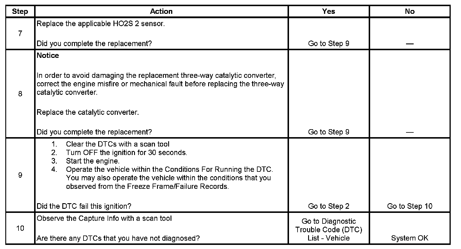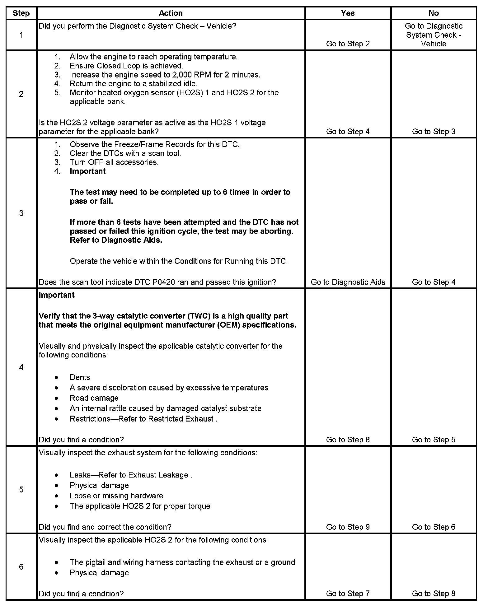 The PCM determines that the efficiency of the catalyst has degraded below a calibrated threshold. This diagnostic may conclude in as few as one test attempt. However, this diagnostic may require as many as 18 test attempts, which would require at least 3 drive cycles. Each test attempt concludes within 2 minutes.