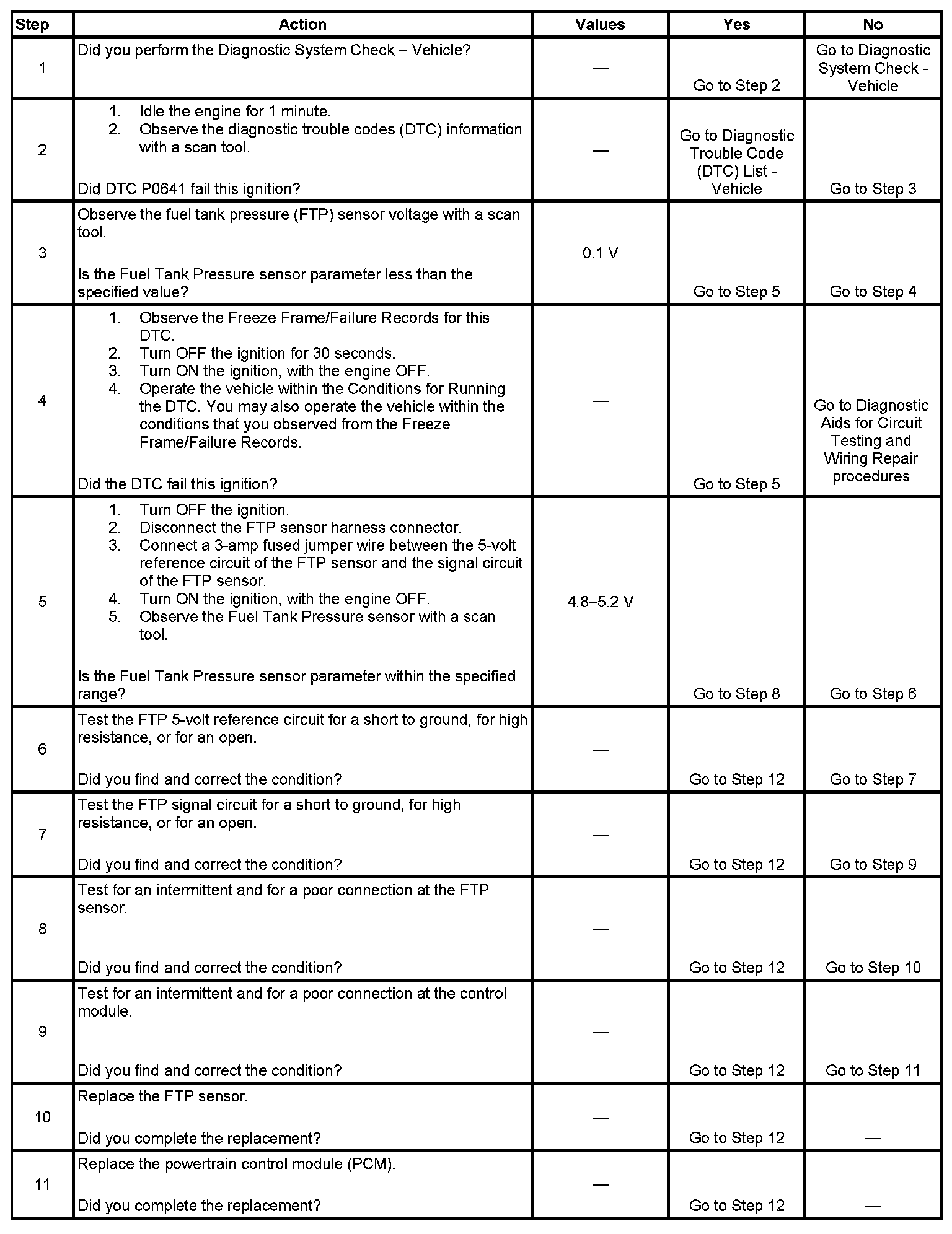 The fuel tank pressure (FTP) sensor measures the difference between the air pressure or vacuum in the evaporative emission (EVAP) system, and the outside air pressure. The control module supplies a 5-volt reference and a low reference circuit to the FTP sensor. The FTP sensor signal circuit voltage varies depending on EVAP system pressure or vacuum. If the FTP sensor signal voltage goes below a calibrated value, this DTC sets.