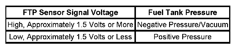 The table illustrates the relationship between FTP sensor signal voltage and the EVAP system pressure/vacuum.