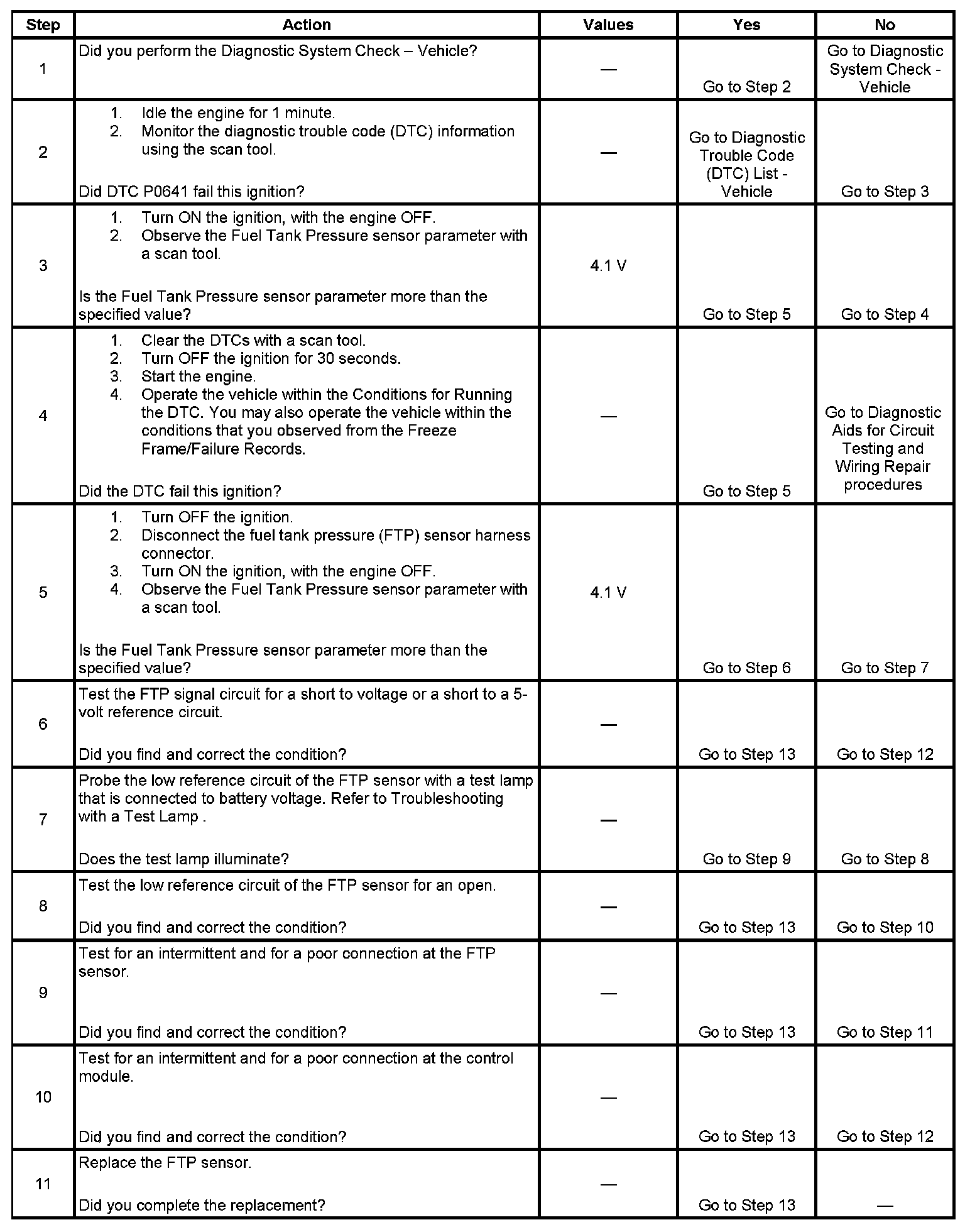 The fuel tank pressure (FTP) sensor measures the difference between the air pressure or vacuum in the evaporative emission (EVAP) system, and the outside air pressure. The control module supplies a 5-volt reference and a low reference circuit to the FTP sensor. The FTP sensor signal circuit voltage varies depending on EVAP system pressure or vacuum. If the FTP sensor signal voltage increases above a calibrated value, this DTC sets.
