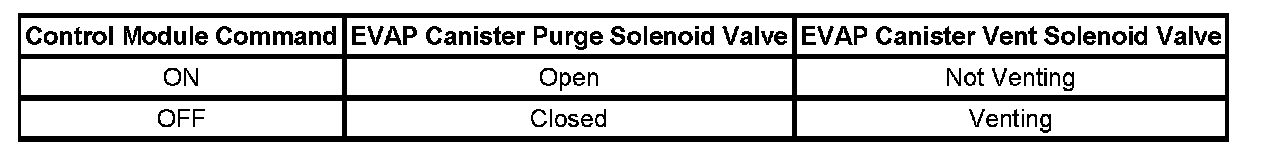 The table illustrates the relationship between the ON and OFF states, and the Venting or Not Venting states of the EVAP canister purge and vent solenoid valves.