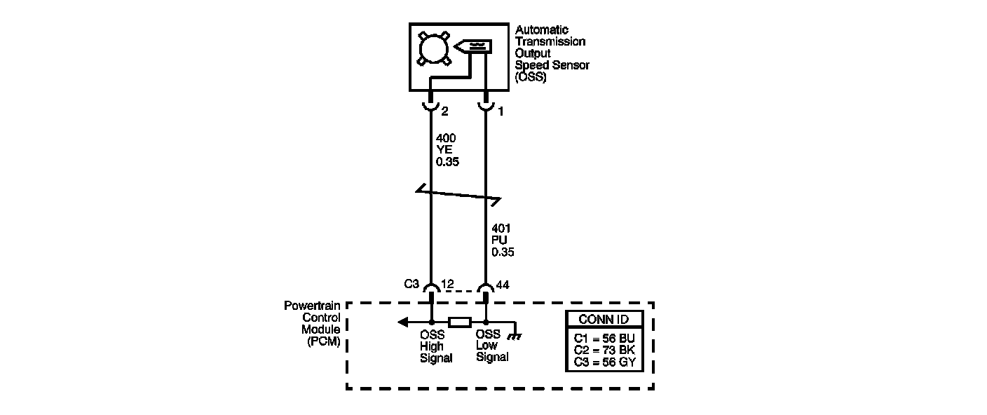 The automatic transmission output speed sensor (OSS) provides vehicle speed information to the powertrain control module (PCM). The OSS is a permanent magnet generator mounted to the transmission case. The OSS produces an AC voltage as the transmission speed sensor rotor teeth pass through the sensor's magnetic field. The AC voltage level increases as the speed of the vehicle increases. The PCM converts the AC voltage into a digital signal. The PCM uses the vehicle speed signal to determine shift timing, torque converter clutch (TCC) apply, TCC release, and gear ratio calculations.