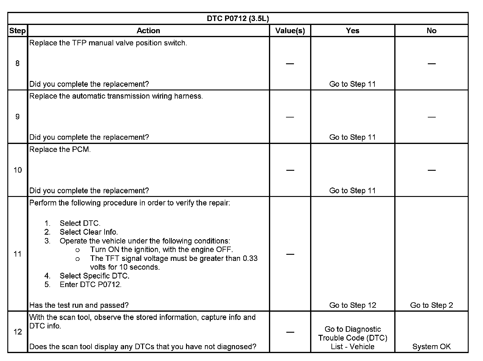 When the PCM detects a continuous short to ground in the TFT circuit or the TFT sensor, then DTC P0712 sets. DTC P0712 is a type C DTC.