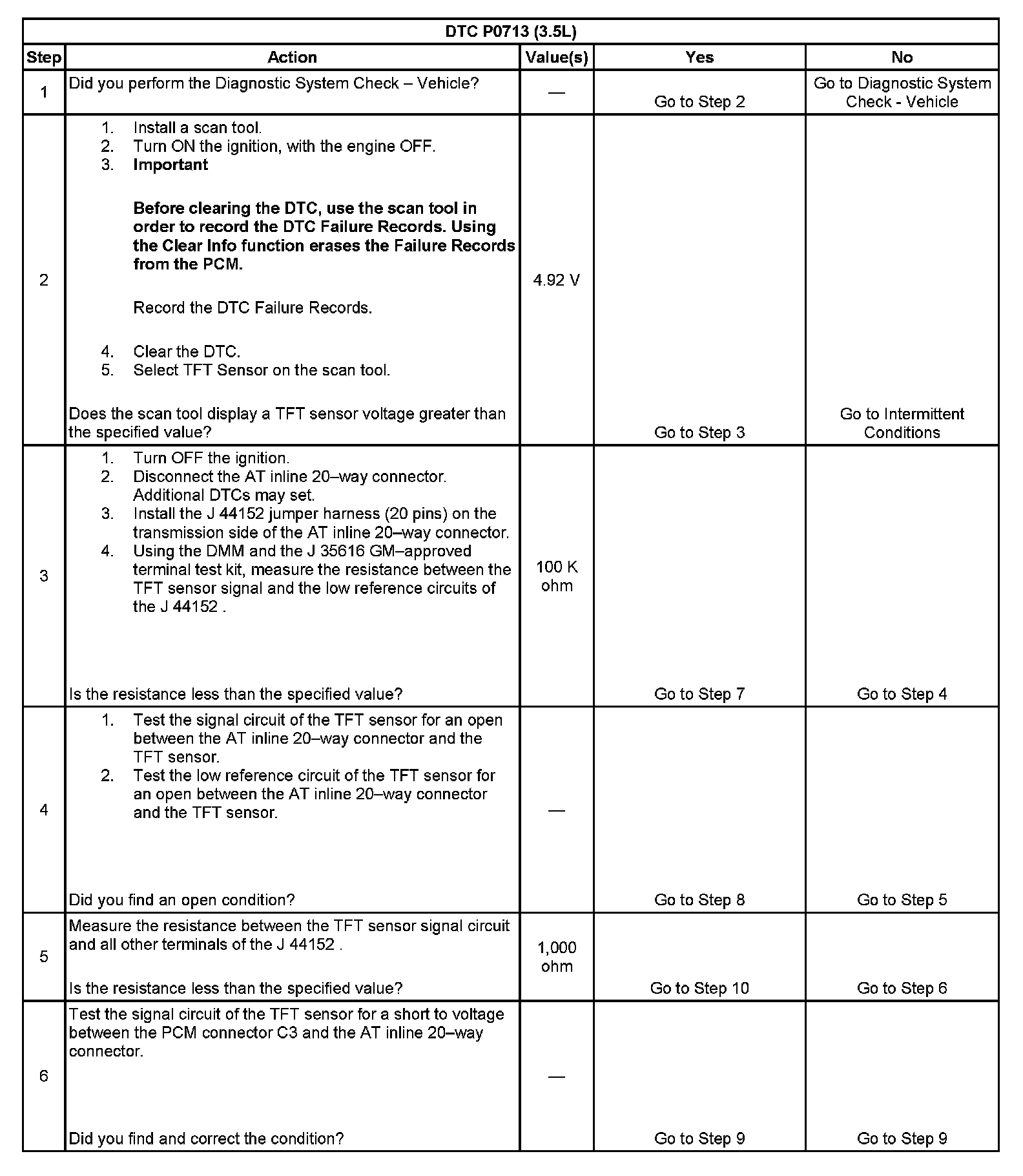 5. This step tests the TFT sensor signal circuit for being shorted to another circuit within the transmission. If the TFT sensor signal circuit shorts to another circuit, which is carrying voltage greater than five volts, the TFT sensor would become open.