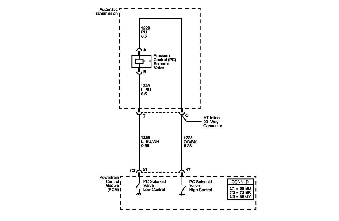 The powertrain control module (PCM) uses the pressure control (PC) solenoid valve in order to regulate the transmission line pressure. The PC solenoid valve consists of an electrical connector, a coil, an armature, a regulating spring, and a poppet valve. The PC solenoid valve is attached to the control valve body. The PCM compares TP voltage, fluid temperature, gear states, and other inputs in order to determine the line pressure appropriate for a given load. The PCM regulates the pressure by applying a varying amperage to the PC solenoid valve. The applied amperage varies from 0.1 amps for maximum line pressure to 1.1 amps for minimum line pressure. The PCM then monitors the amperage at the return line.