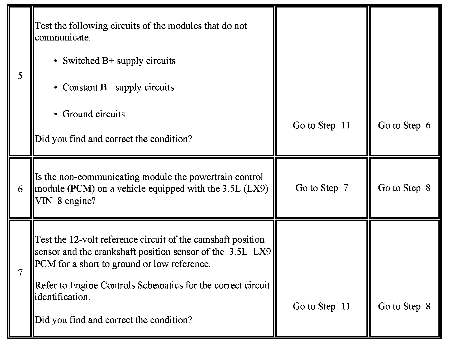 7. The powertrain control module (PCM) that is used in the 3.5L (LX9) powertrain package can lose communication with the buss if there is a malfunction in the camshaft position (CMP) or the crankshaft position (CKP) sensors 12-volt reference circuit.