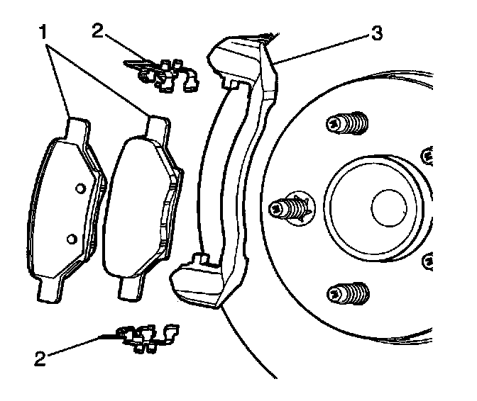8. Remove the brake pad retainers (2) from the brake caliper mounting bracket (3).